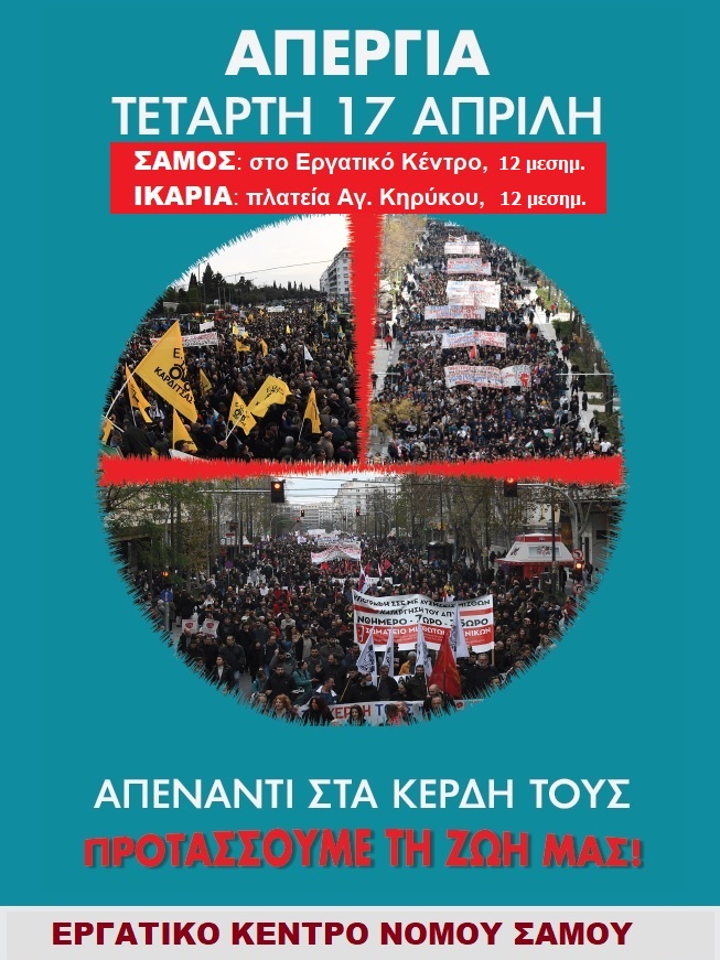 ΑΠΕΡΓΙΑ στις 17 Απρίλη : Απέναντι στα κέρδη τους προτάσσουμε τη ζωή μας !